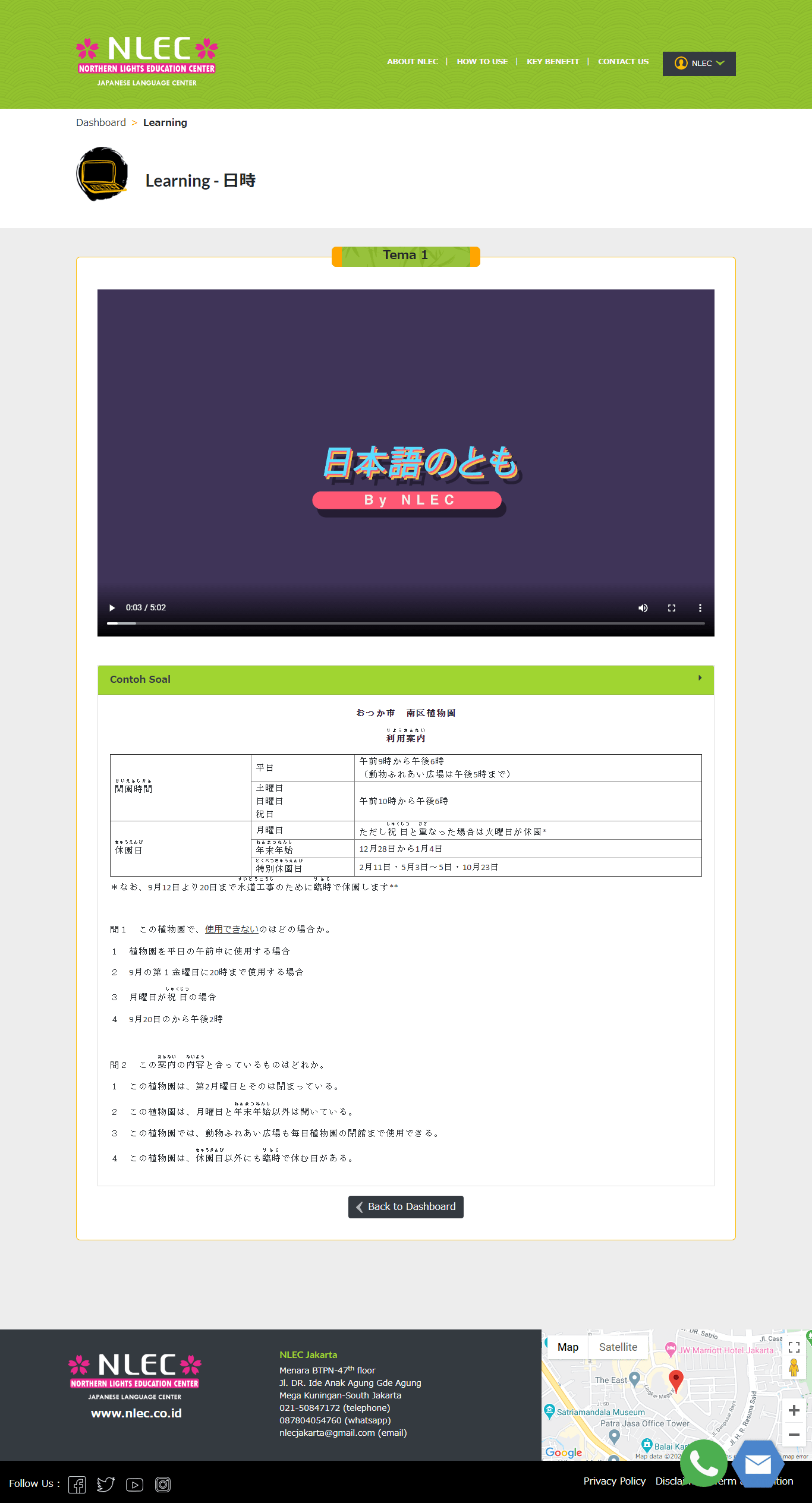 NLEC Nihongo terfokus kepada teknik-teknik mengerjakan soal dan latihan soal reading(読解. Tetapi, di dalamnya juga terdapat latihan soal grammar(文法)kanji(漢字)vocabulary(語彙)di bagian WARMING UP yang merupakan bagian dari rangkaian pembelajaran sebagai pemanasan sebelum mengerjakan soal reading.