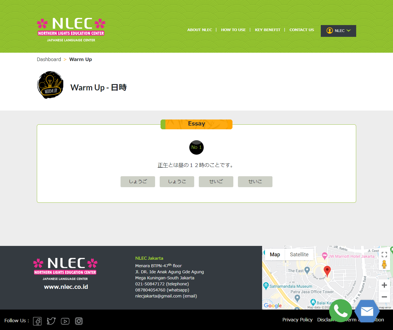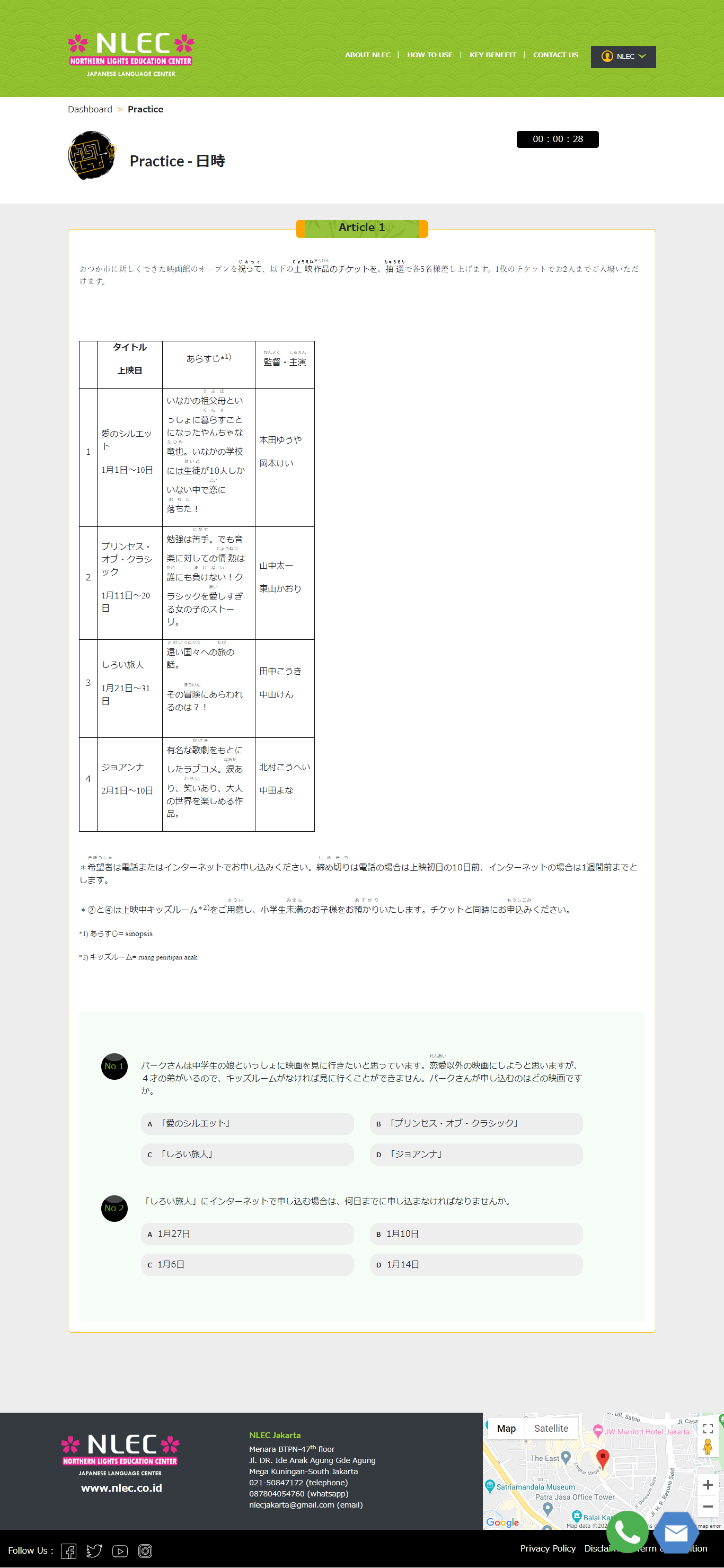 Di bagian ini kamu akan mengaplikasikan ilmu yang sudah dipelajari lewat video dengan mengerjakan soal-soal reading. Kami memasang beberapa soal yang mungkin sedikit diatas standar N3. Biar pas ujian aslinya nanti, kamu udah siap di segala medan. Ohya, kamu juga ngga perlu khawatir, saat jawaban yang kamu pilih salah, akan ada penjelasannya. Jadi kamu ngga perlu spekulasi yaa. Masih belum cukup? Tenang, ada fitur chat yang siap menghubungkan kamu dengan sensei NLEC! Ohya, kami juga menyediakan fitur pengukur waktu, biar kamu tahu perkembangan kecepatan latihan readingnya. Jadi, saat ujian nanti ngga ada acara kelabakan karena waktu abis.