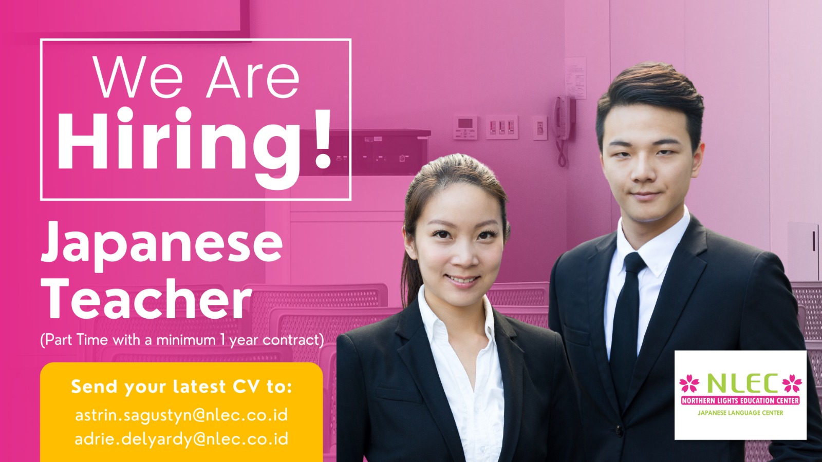 Dear Mina-san, Ada kabar baik nih Mina-san! Dikarenakan animo masyarakat yang tinggi, kami membuka banyak kelas baru dan membuka lowongan kerja sebagai Part Time Japanese Teacher. Untuk kamu yang memiliki passion dalam menagajar, mari segera bergabung dengan NLEC untuk memajukan Pendidikan Bahasa Jepang yang berkualitas di Indonesia. Kirim lamaran Anda sekarang ke email astrin.sagustyn@nlec.co.id dan adrie.delyardy@nlec.co.id